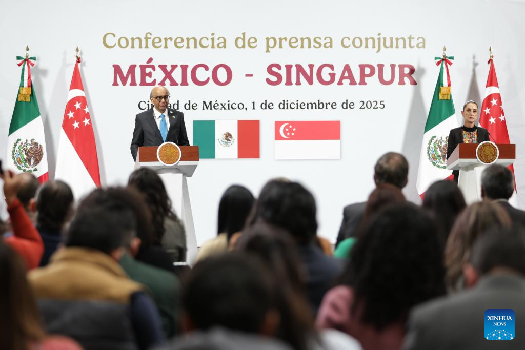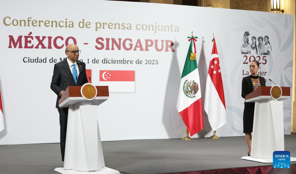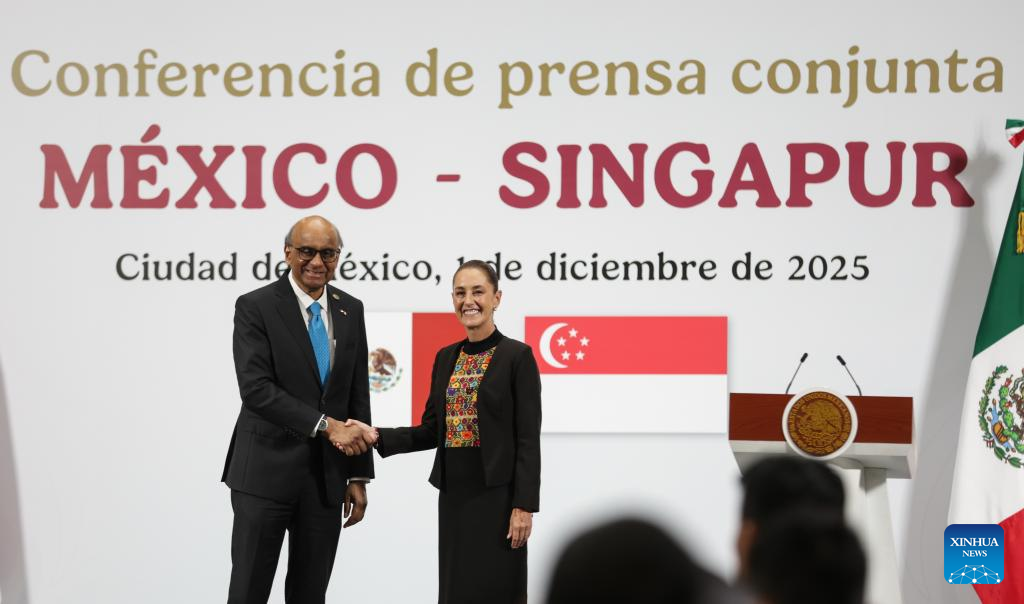 Mexican President Claudia Sheinbaum (R) shakes hands with visiting Singaporean President Tharman Shanmugaratnam during a joint press conference at the National Palace in Mexico City, Mexico, Dec. 1, 2025. (Photo by Francisco Canedo/Xinhua)