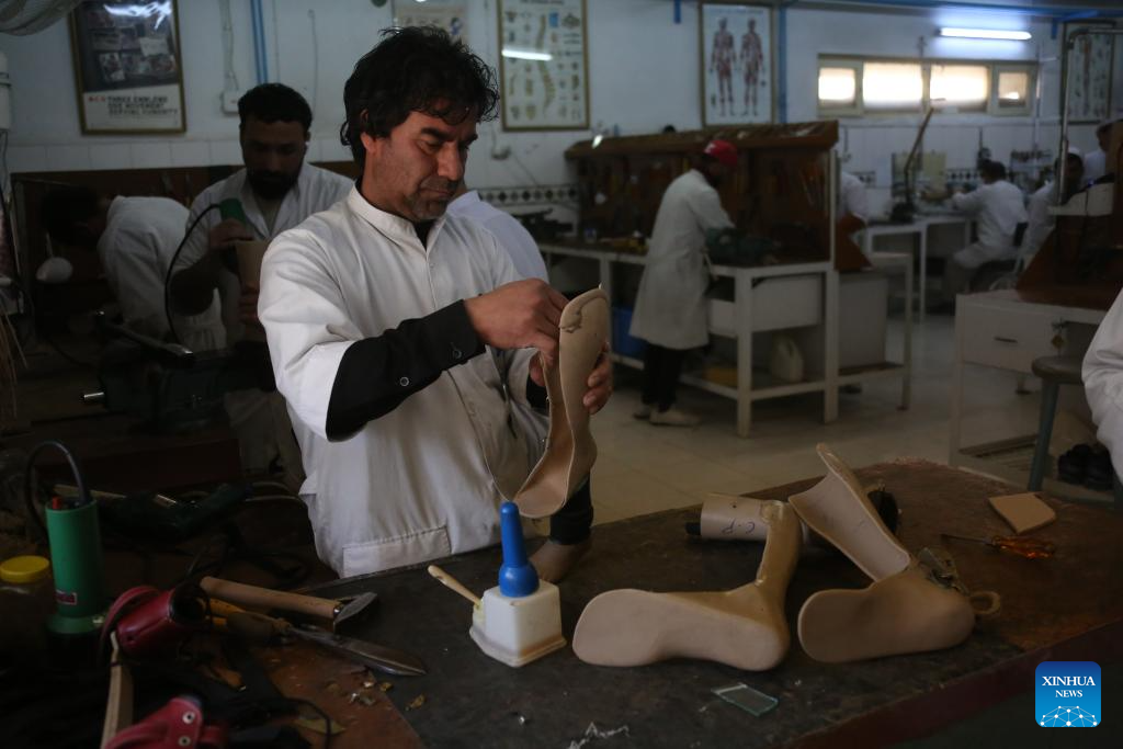 Staff members work on prosthetic legs at a rehabilitation center run by the International Committee of the Red Cross (ICRC) hospital in Kabul, Afghanistan, Nov. 30, 2025. (Photo by Saifurahman Safi/Xinhua)