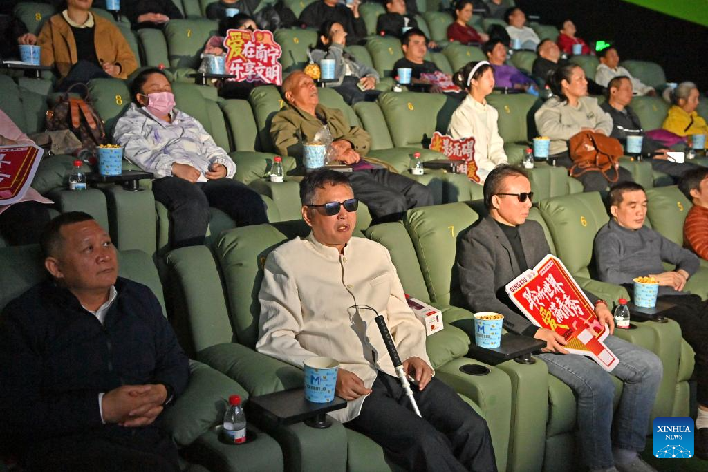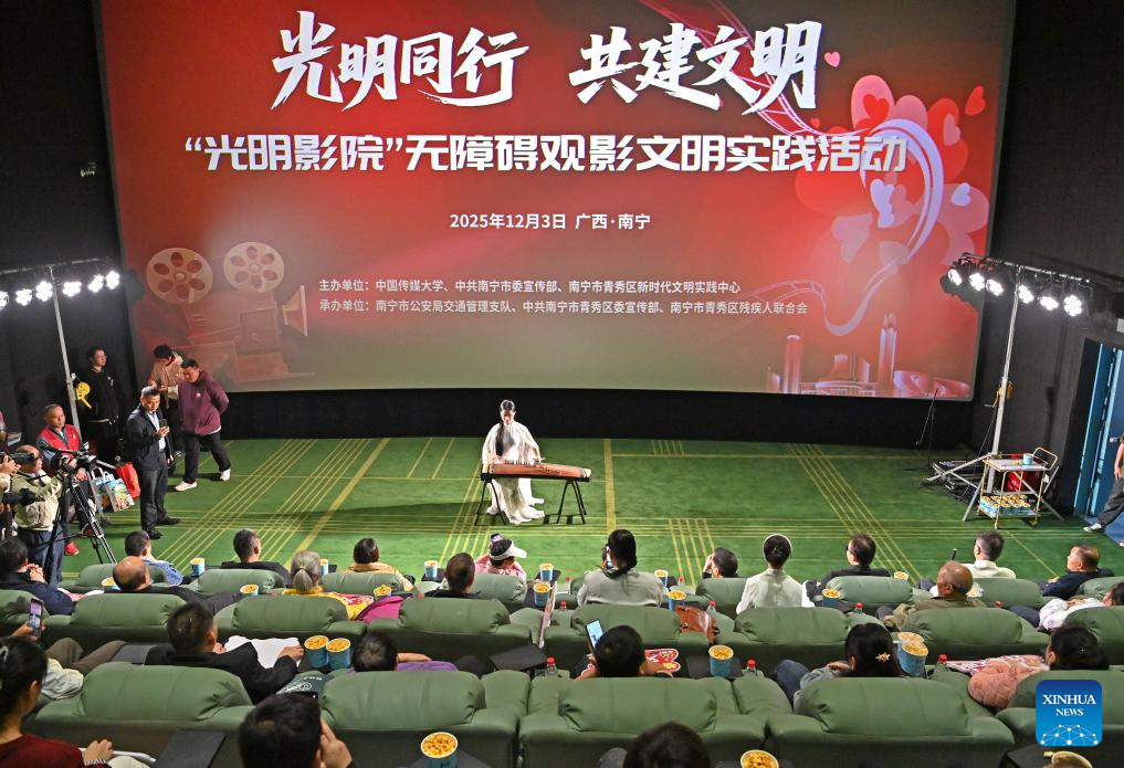 Visually-impaired people, together with their family members and volunteers, enjoy a movie at a cinema in Nanning, south China's Guangxi Zhuang Autonomous Region, Dec. 3, 2025. Wednesday marks the 34th International Day of Persons with Disabilities. More than 40 visually-impaired people enjoyed a barrier-free version of the movie "One and Only" under the Cinema of Light, a public welfare initiative initiated in 2017 by the Communication University of China.