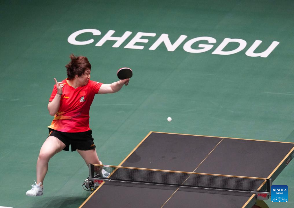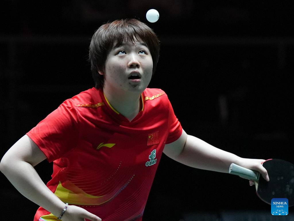 Kuai Man of China hits a return during the women's singles match against Ivana Malobabic of Croatia during the stage 2 match between China and Croatia at the ITTF Mixed Team World Cup 2025 in Chengdu, southwest China's Sichuan Province, Dec. 3, 2025. (Xinhua/Wang Ying)