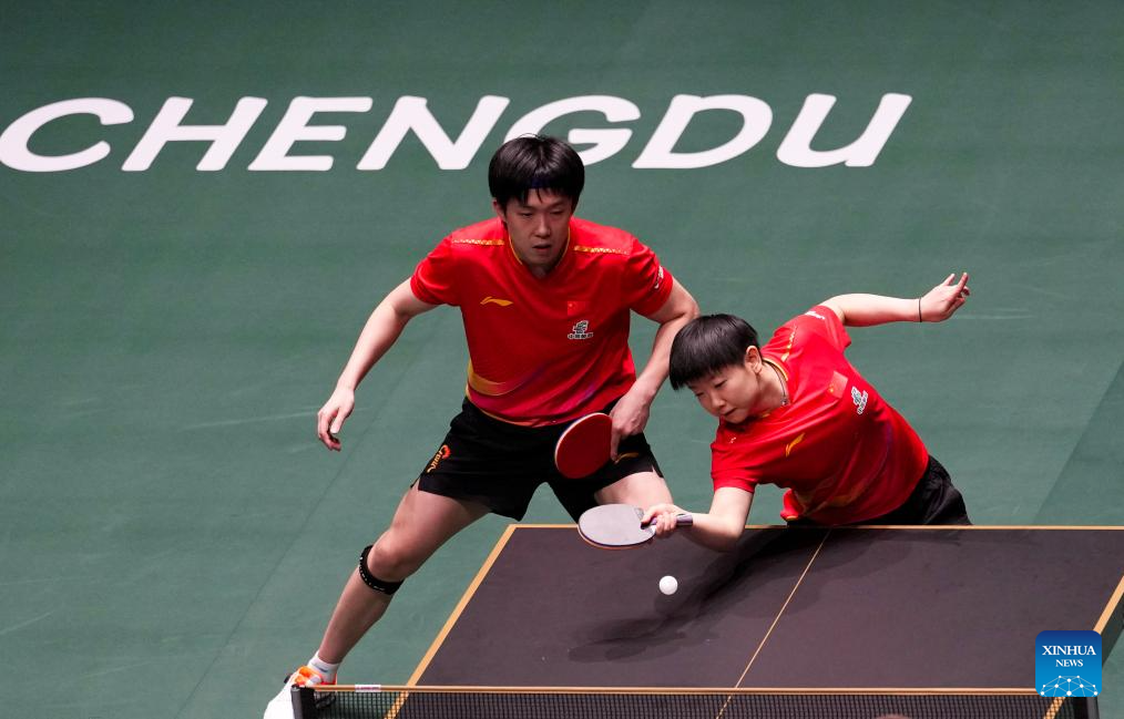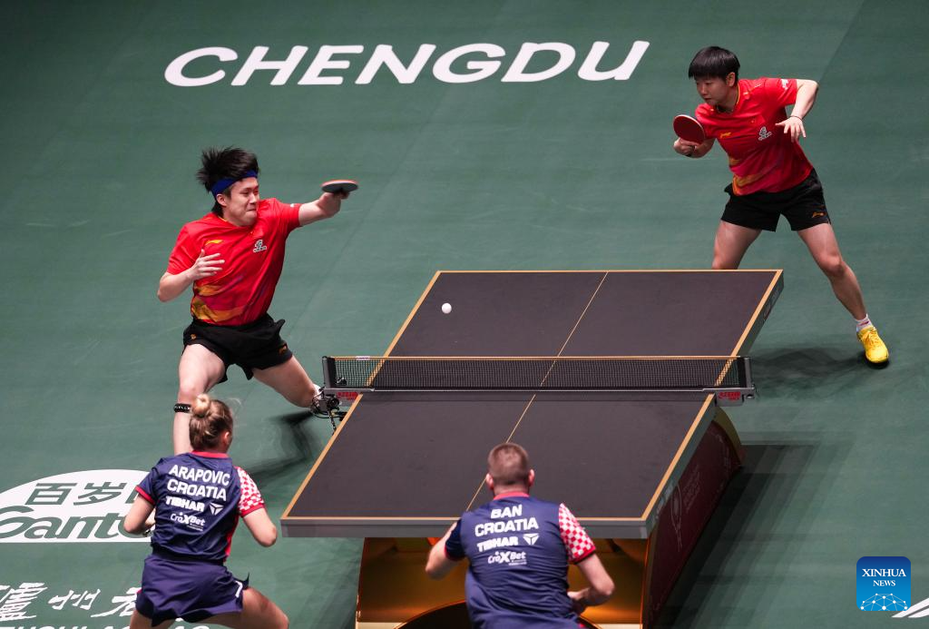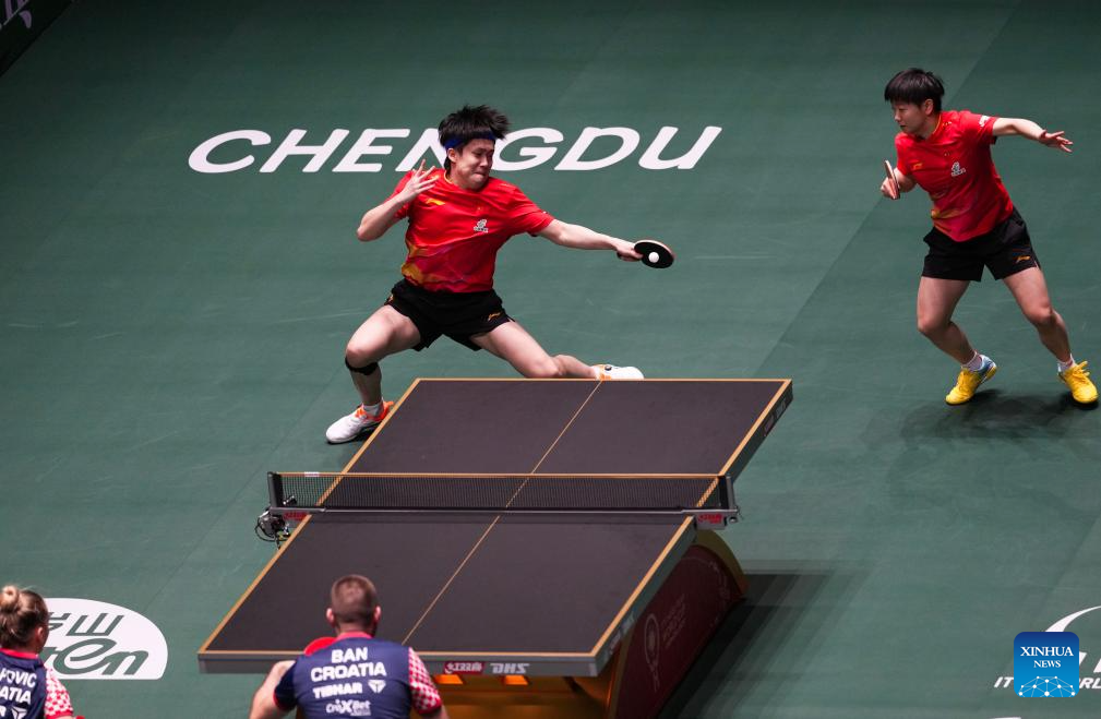 Wang Chuqin/Sun Yingsha(R) of China compete during the mixed doubles match against Ivor Ban/Hana Arapovic of Croatia during the stage 2 match between China and Croatia at the ITTF Mixed Team World Cup 2025 in Chengdu, southwest China's Sichuan Province, Dec. 3, 2025. (Xinhua/Wang Ying)