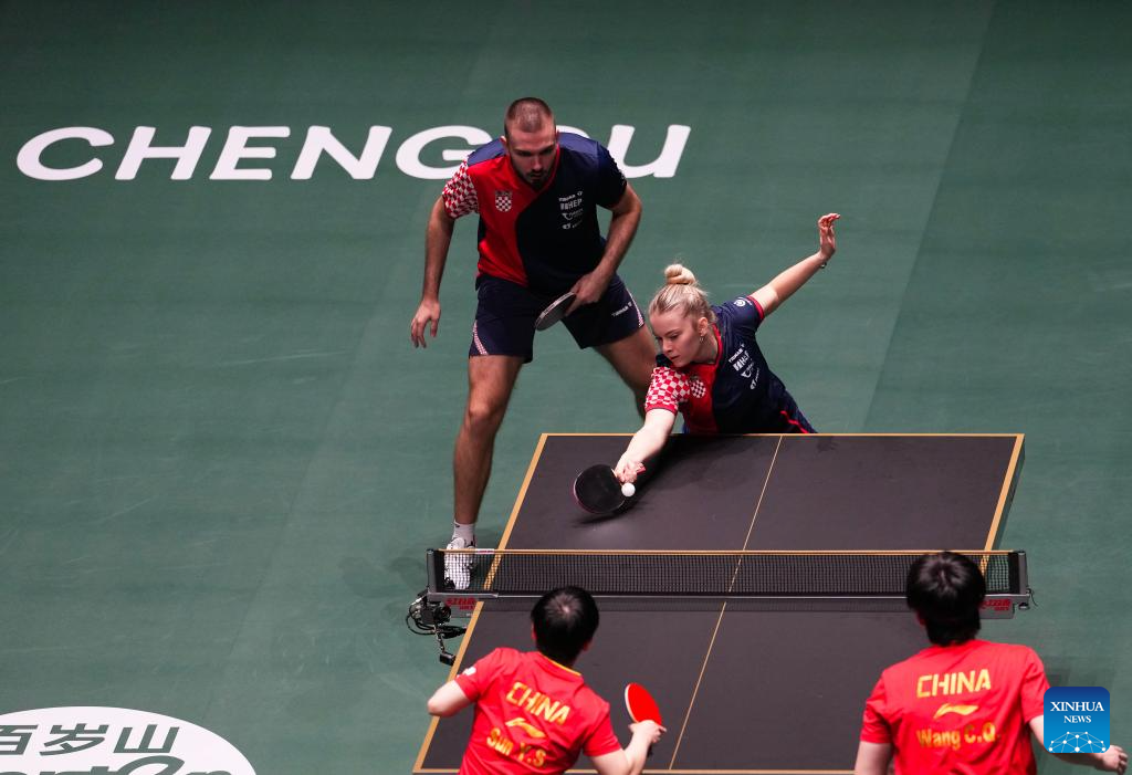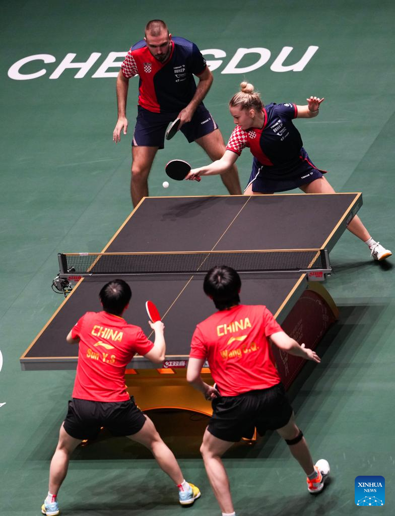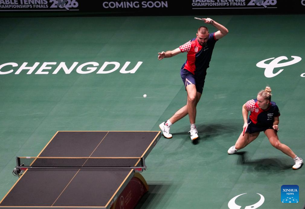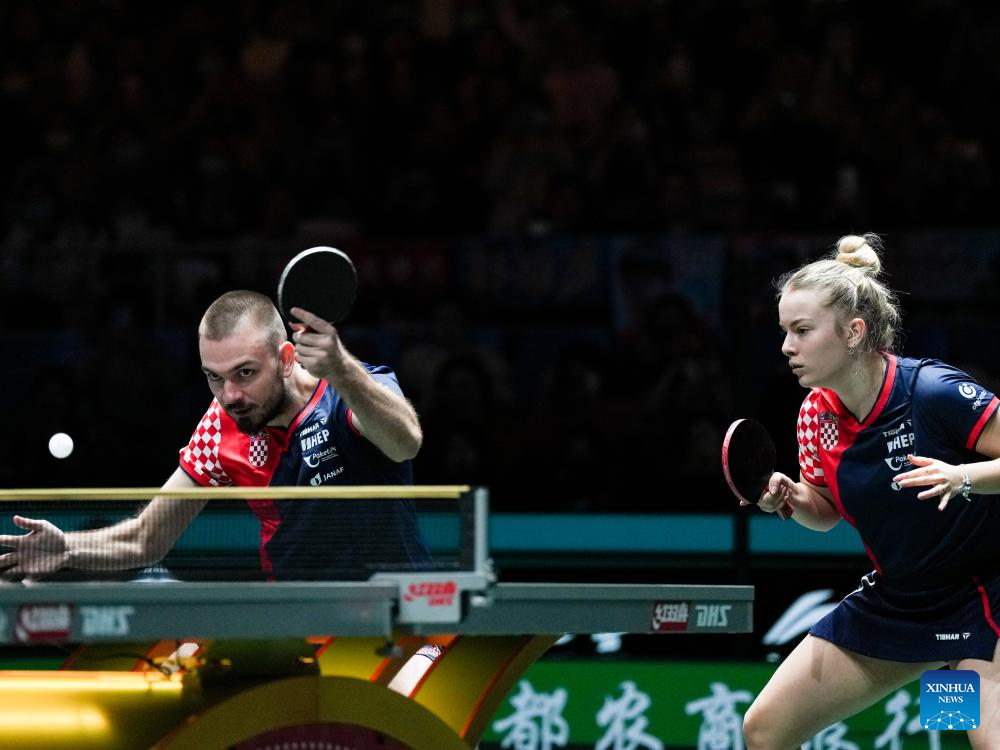 Ivor Ban(L)/Hana Arapovic of Croatia compete during the mixed doubles match against Wang Chuqin/Sun Yingsha of China during the stage 2 match between China and Croatia at the ITTF Mixed Team World Cup 2025 in Chengdu, southwest China's Sichuan Province, Dec. 3, 2025. (Xinhua/Wang Ying)