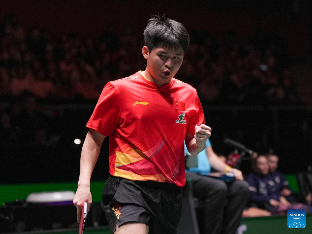 Lin Shidong of China reacts during the men's singles match against Tomislav Pucar of Croatia during the stage 2 match between China and Croatia at the ITTF Mixed Team World Cup 2025 in Chengdu, southwest China's Sichuan Province, Dec. 3, 2025. (Xinhua/Wang Xi)