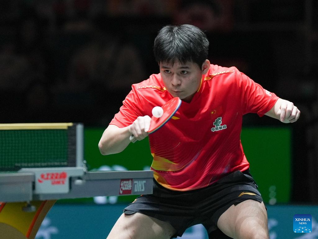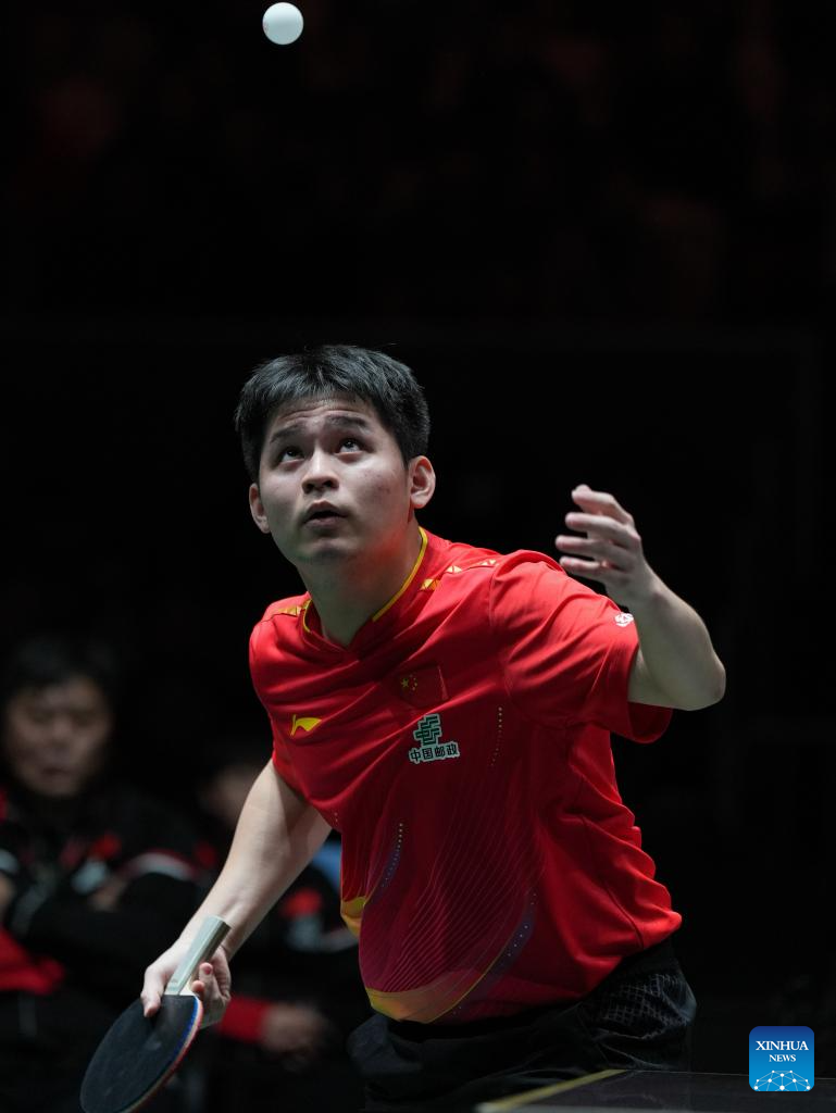 Lin Shidong of China hits a return during the men's singles match against Tomislav Pucar of Croatia during the stage 2 match between China and Croatia at the ITTF Mixed Team World Cup 2025 in Chengdu, southwest China's Sichuan Province, Dec. 3, 2025. (Xinhua/Wang Xi)
