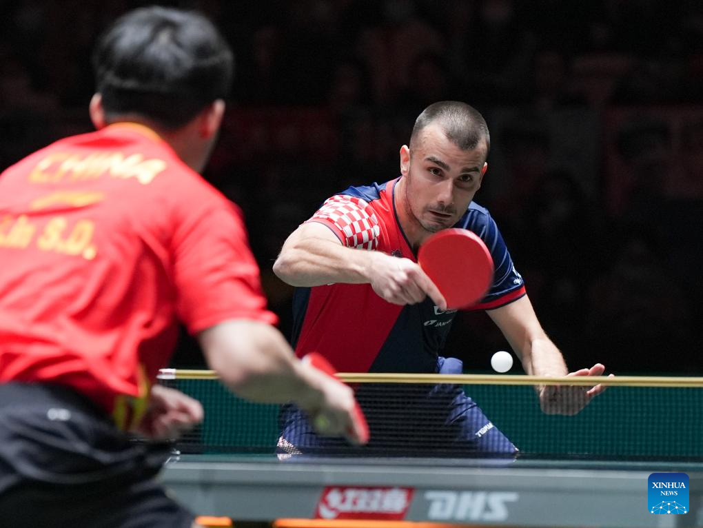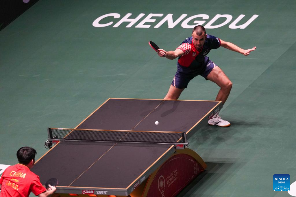 Tomislav Pucar of Croatia hits a return during the men's singles match against Lin Shidong of China during the stage 2 match between China and Croatia at the ITTF Mixed Team World Cup 2025 in Chengdu, southwest China's Sichuan Province, Dec. 3, 2025. (Xinhua/Wang Ying)