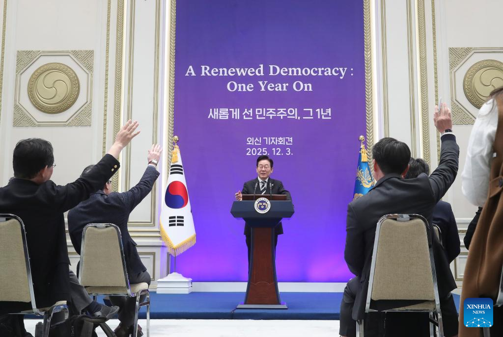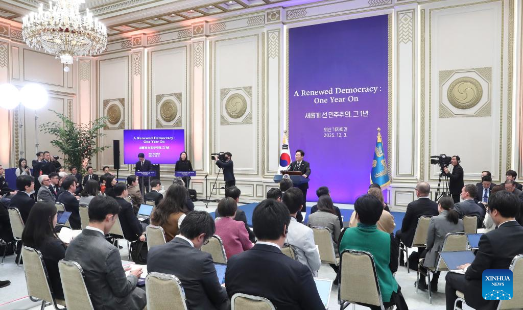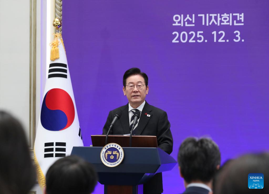 South Korean President Lee Jae Myung speaks at a press conference in Seoul, South Korea, on Dec. 3, 2025. Lee said Wednesday that his government will designate Dec. 3 as People's Sovereignty Day to mark the overcoming of the martial law crisis. (Xinhua/Yao Qilin)