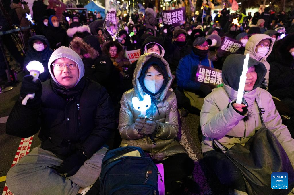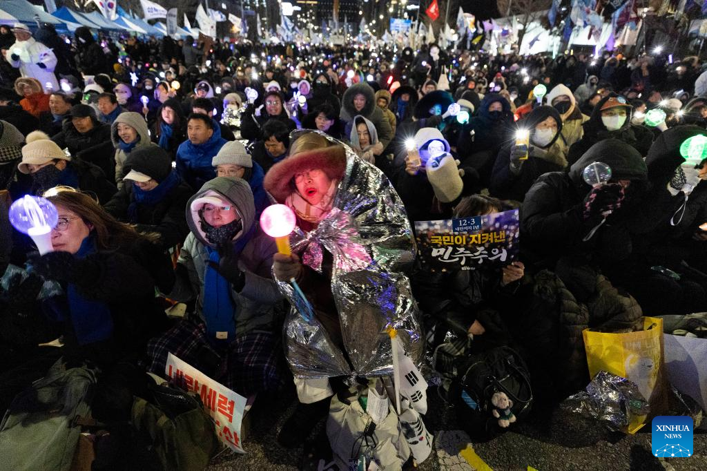People gather near the National Assembly in Seoul, South Korea, on Dec. 3, 2025. South Korean President Lee Jae Myung said Wednesday that his government will designate Dec. 3 as People's Sovereignty Day to mark the overcoming of the martial law crisis. (Photo by Jun Hyosang/Xinhua)