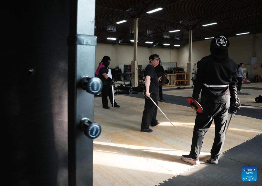 This photo shows a scene on a sword and shield course at the Shanghai Historical Martial Arts (SHMA) club in Shanghai, east China, Nov. 22, 2025. (Xinhua/Liu Ying)