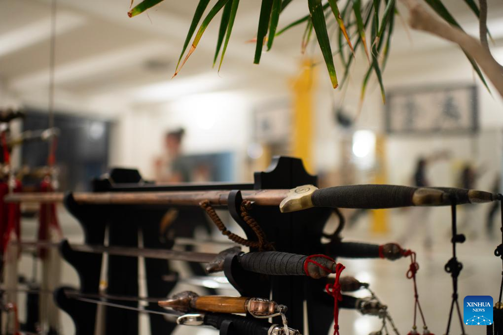 Tai Chi Swords are seen at XUAN-Gong Fu Academy in Berlin, Germany, Nov. 13, 2025. (Xinhua/Zhang Haofu)