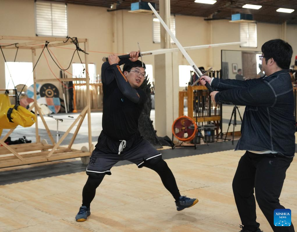 She Yuran practices longswords with a friend at the Shanghai Historical Martial Arts (SHMA) club in Shanghai, east China, Nov. 22, 2025. (Xinhua/Liu Ying)