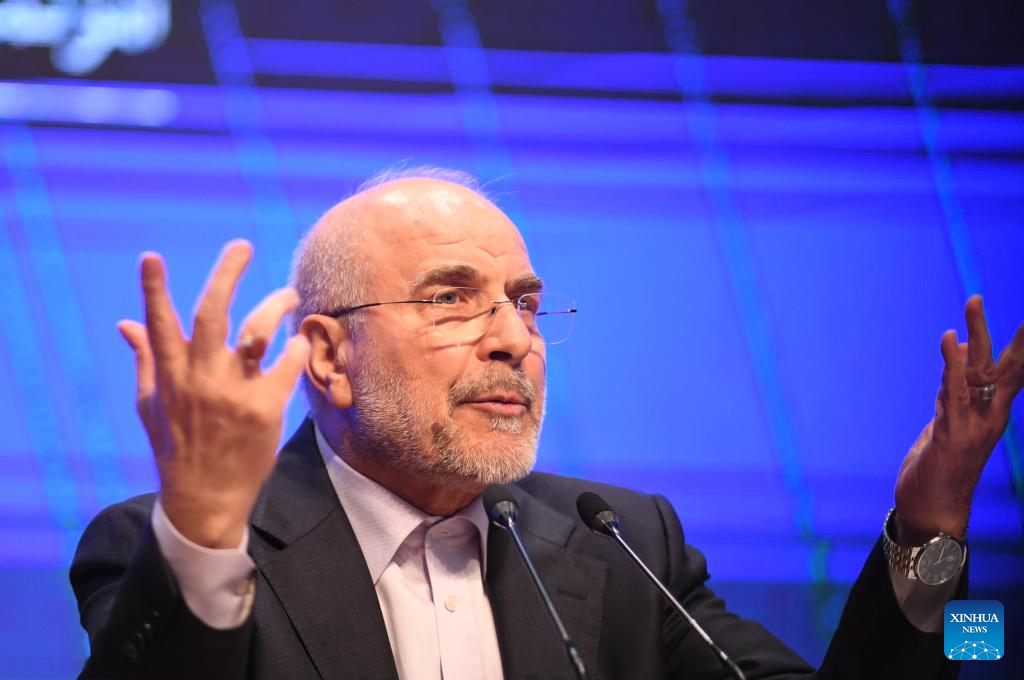 Iranian Parliament Speaker Mohammad Bagher Ghalibaf speaks at a press conference in Tehran, Iran, Dec. 2, 2025. Ghalibaf said on Tuesday that the main problem preventing the resumption of talks between Iran and the United States is the latter's "excessive demands."