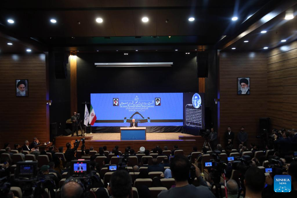 This photo taken on Dec. 2, 2025 shows the scene during a press conference in Tehran, Iran. Iranian Parliament Speaker Mohammad Bagher Ghalibaf said on Tuesday that the main problem preventing the resumption of talks between Iran and the United States is the latter's "excessive demands." He made the remarks at a press conference in the Iranian capital, Tehran, on the occasion of the National Parliament Day, while elaborating on the reasons preventing the resumption of nuclear negotiations with the United States. Ghalibaf said the United States does not want to negotiate but instead aims to impose its demands and force Iran to give in. (Xinhua/Shadati)