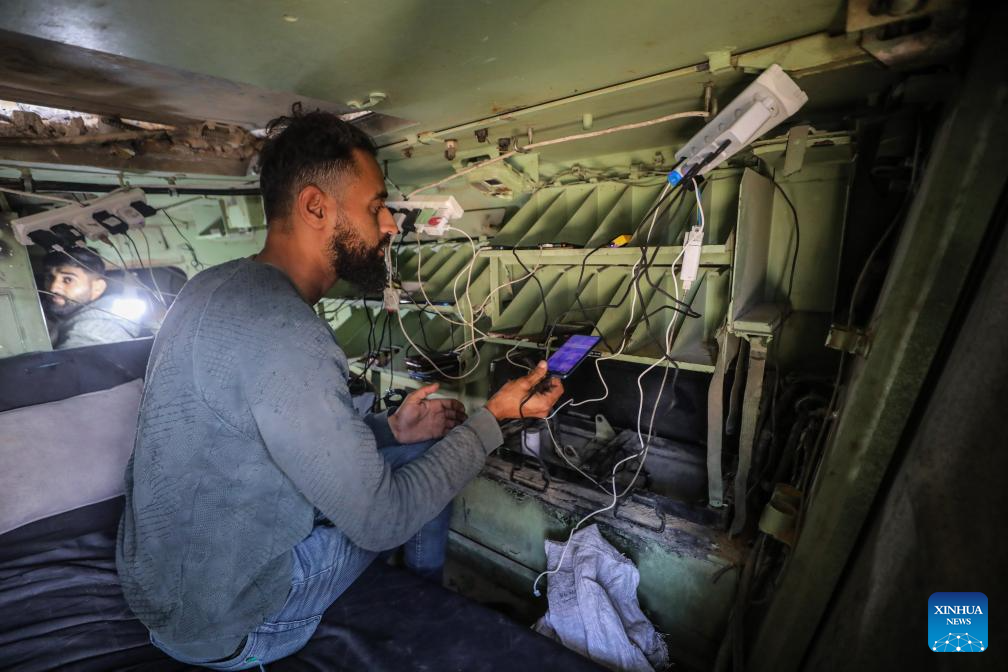 A Palestinian uses power source inside the abandoned Israeli army vehicle, in Gaza City, on Nov. 30, 2025. (Photo by Rizek Abdeljawad/Xinhua)