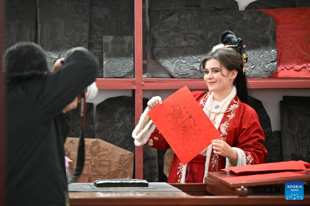 A tourist takes photos after experiencing making a woodblock new year picture at Yangliuqing ancient town in Tianjin, north China, on Dec. 3, 2025. Sitting on the outskirts of the port city of Tianjin, Yangliuqing ancient town is a tourist town that is well-known for its woodblock new year pictures. It is run through by the Grand Canal, the world's longest man-made waterway. (Xinhua/Zhao Zishuo)