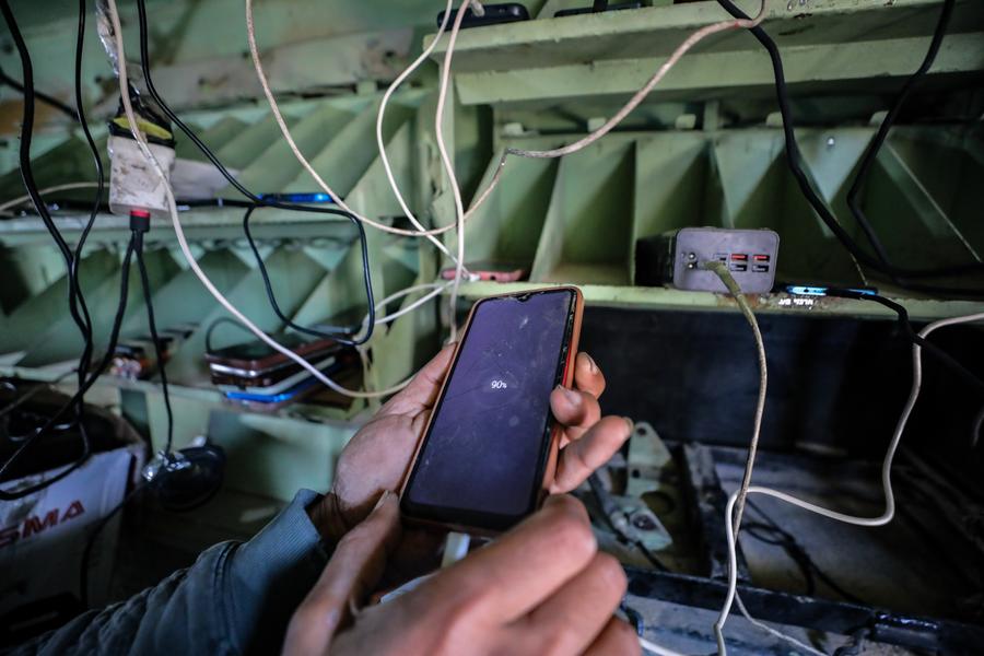 GAZA, Dec. 3 (Xinhua) -- In the rubble of southwestern Gaza City's Tel al-Hawa neighborhood, an abandoned Israeli armored vehicle now serves an unexpected purpose: Draped with a red-cloth sign that reads "Charging Station," it has become a rare source of electricity in an area left in the dark by over two years of conflict.