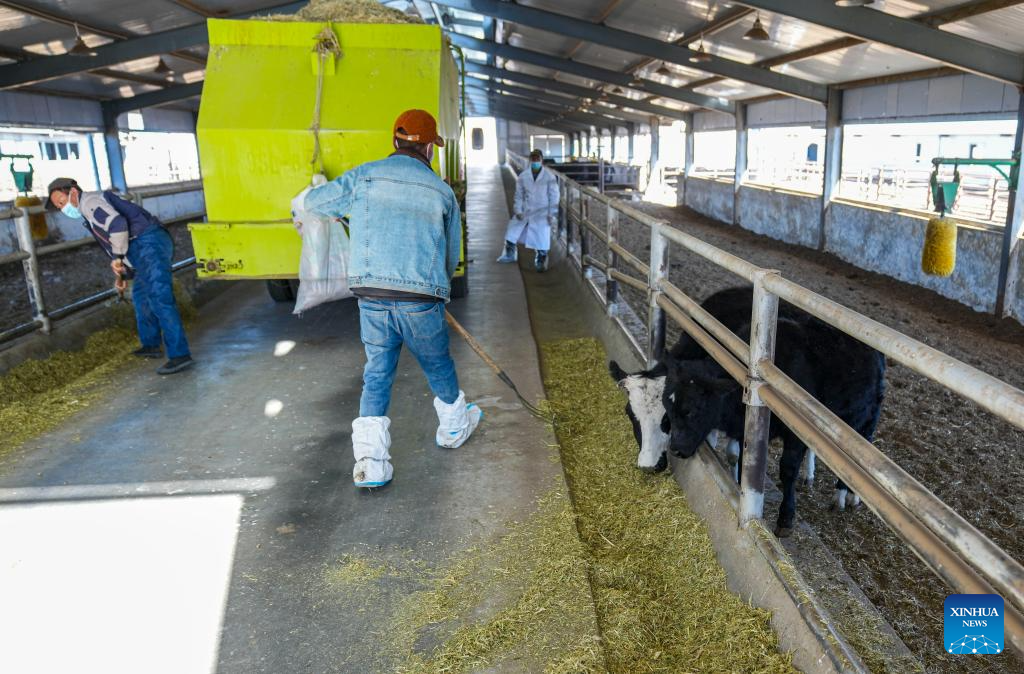 A staff member feeds the cloned Zhangmu calf (R) at the Qushui experiment station of the regional-level animal disease prevention and control center in Lhasa, southwest China's Xizang Autonomous Region, Dec. 3, 2025. (Xinhua/Tenzin Nyida)