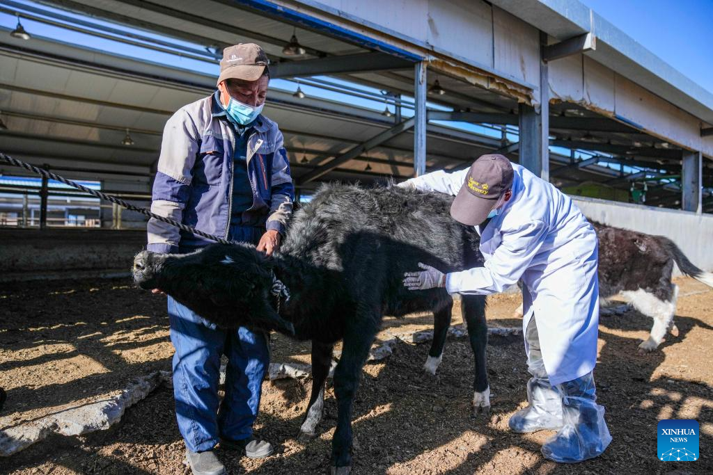 A staff member checks the eyelids of a cloned Zhangmu calf at the Qushui experiment station of the regional-level animal disease prevention and control center in Lhasa, southwest China's Xizang Autonomous Region, Dec. 3, 2025. (Xinhua/Tenzin Nyida)