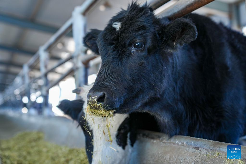 A cloned Zhangmu calf forages at the Qushui experiment station of the regional-level animal disease prevention and control center in Lhasa, southwest China's Xizang Autonomous Region, Dec. 3, 2025. The Zhangmu is a rare yellow cattle breed native to the Qinghai-Xizang Plateau.