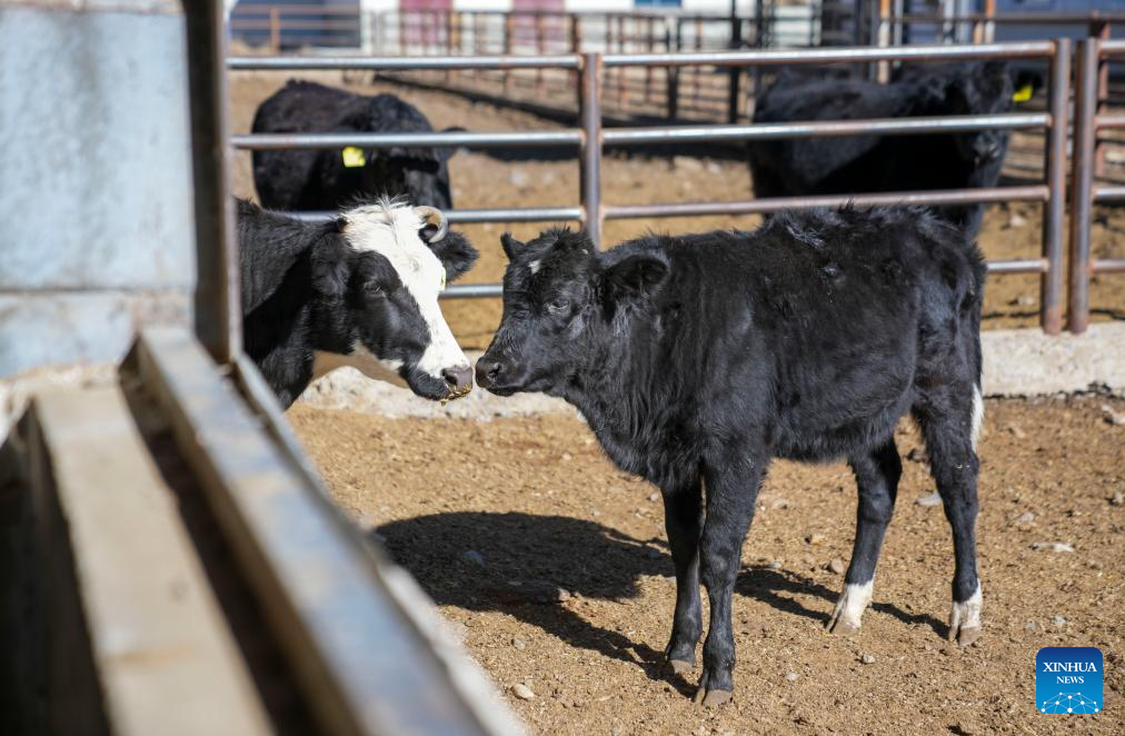 A cloned Zhangmu calf (R) is seen at the Qushui experiment station of the regional-level animal disease prevention and control center in Lhasa, southwest China's Xizang Autonomous Region, Dec. 3, 2025. (Xinhua/Tenzin Nyida)