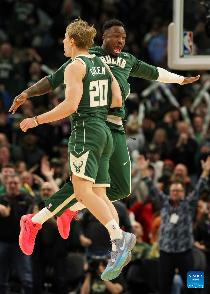 AJ Green (front) and Thanasis Antetokounmpo of Milwaukee Bucks celebrate taking the lead during the 2025-2026 NBA regular season game between Milwaukee Bucks and Detroit Pistons in Milwaukee, the United States, on Dec. 3, 2025. (Photo by Joel Lerner/Xinhua)