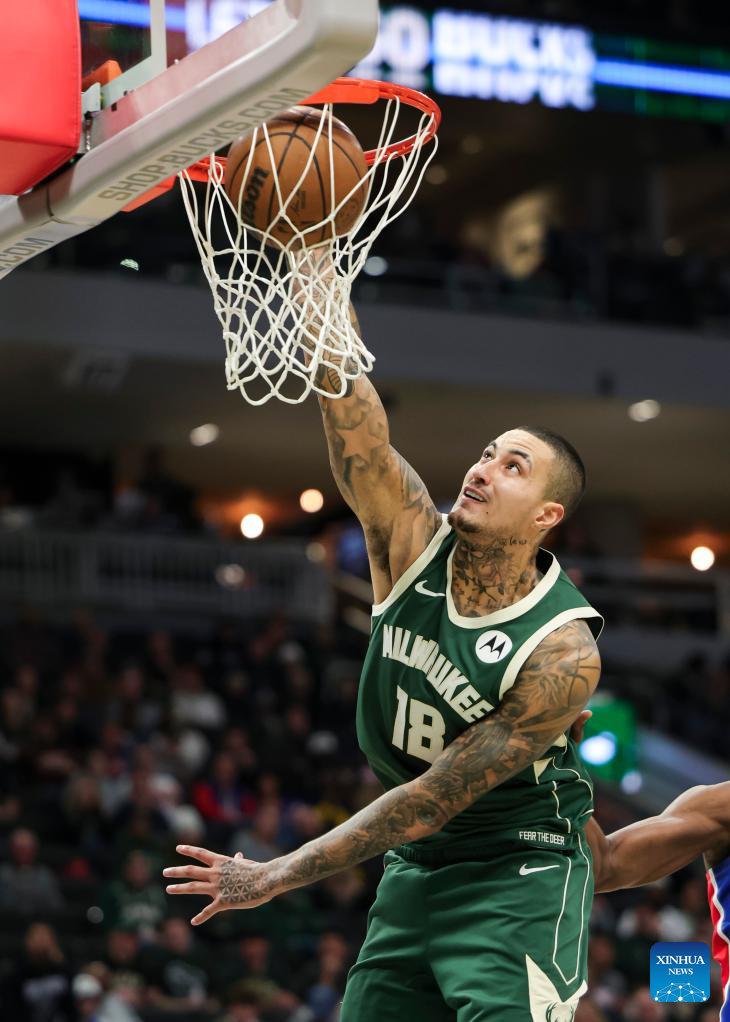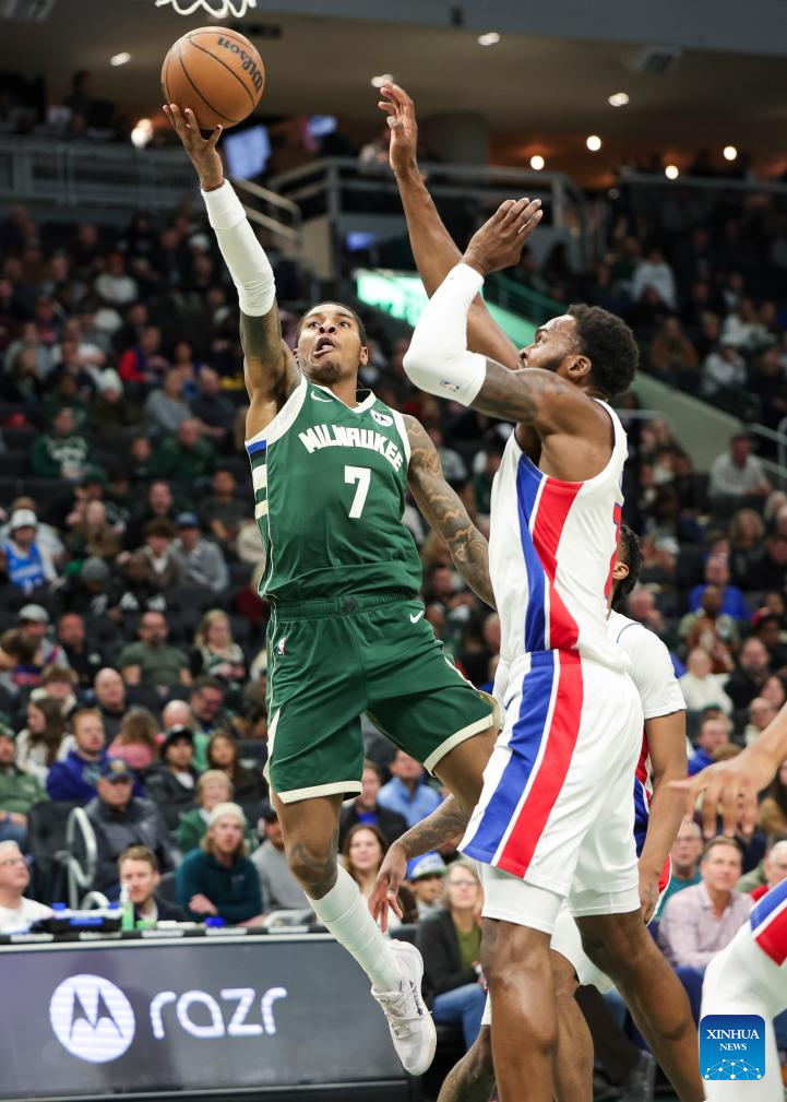 Kevin Porter Jr. (L) of Milwaukee Bucks goes for a layup during the 2025-2026 NBA regular season game between Milwaukee Bucks and Detroit Pistons in Milwaukee, the United States, on Dec. 3, 2025. (Photo by Joel Lerner/Xinhua)