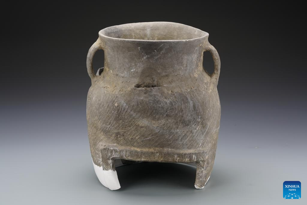 This undated file photo shows a cooking vessel unearthed at the Luojiahe cultural relic site in Chunhua County, Xianyang City, northwest China's Shaanxi Province. Multiple grain storage pits dating back more than 4,000 years were discovered in northwest China's Shaanxi Province, which offer fresh evidence for the study of early civilization in that area, according to archaeologists.