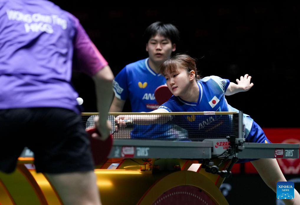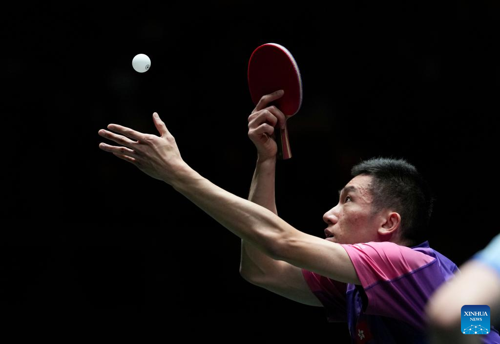 Wong Chun Ting (R)/Doo Hoi Kem of China's Hong Kong compete in the mixed doubles match against Matsushima Sora/Odo Satsuki of Japan during the stage 2 group match between Japan and China's Hong Kong at the ITTF Mixed Team World Cup 2025 in Chengdu, southwest China's Sichuan Province, Dec. 3, 2025. (Xinhua/Wang Ying)