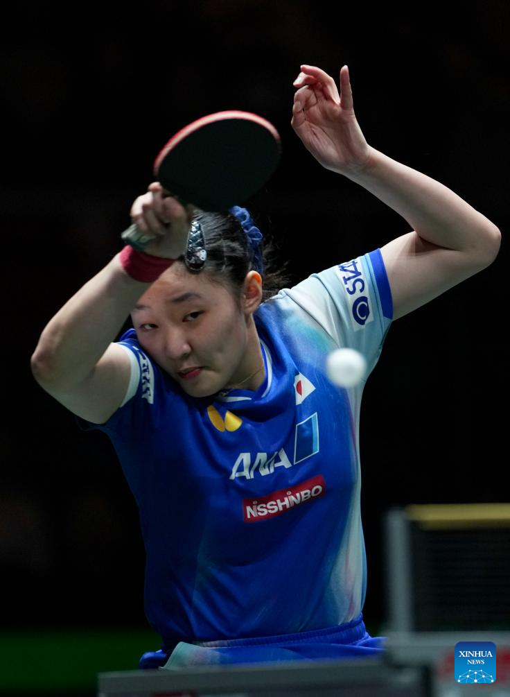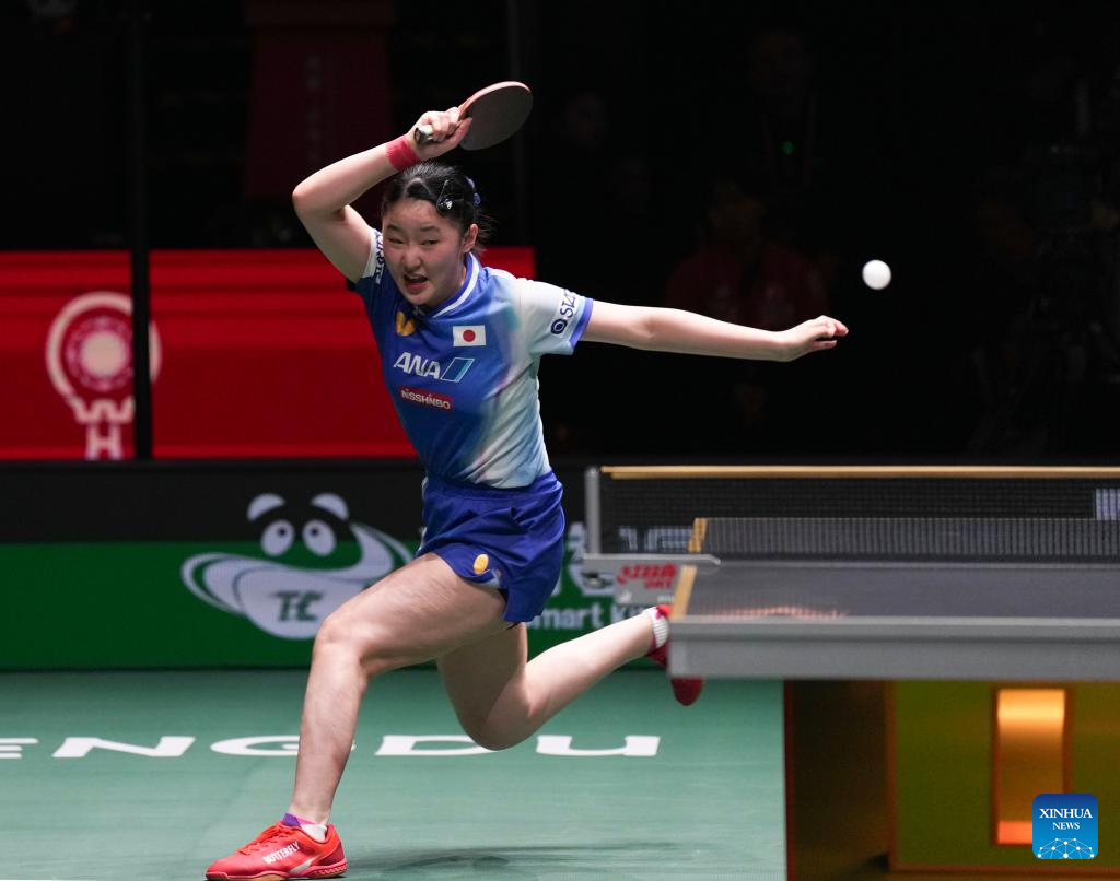 Harimoto Miwa of Japan hits a return in the women's singles match against Zhu Chengzhu of China's Hong Kong during the stage 2 group match between Japan and China's Hong Kong at the ITTF Mixed Team World Cup 2025 in Chengdu, southwest China's Sichuan Province, Dec. 3, 2025. (Xinhua/Wang Ying)