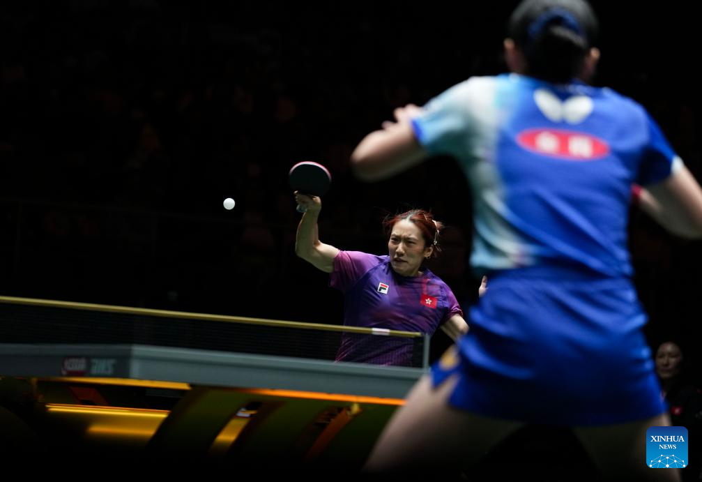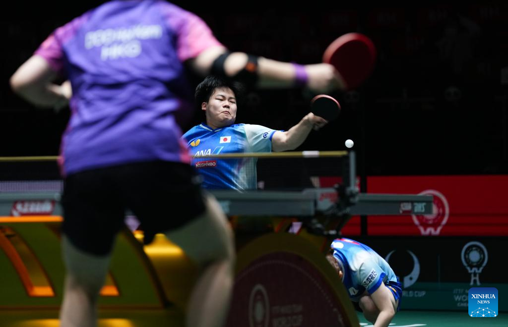 Zhu Chengzhu of China's Hong Kong hits a return in the women's singles match against Harimoto Miwa of Japan during the stage 2 group match between Japan and China's Hong Kong at the ITTF Mixed Team World Cup 2025 in Chengdu, southwest China's Sichuan Province, Dec. 3, 2025. (Xinhua/Wang Ying)