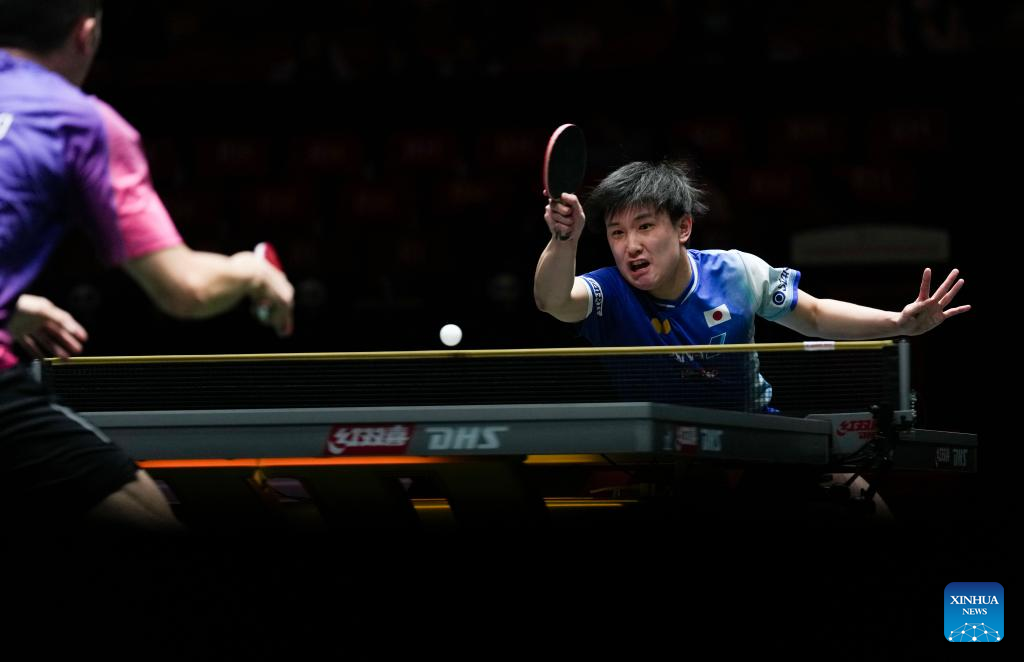 Harimoto Tomokazu of Japan hits a return in the men's singles match against Lam Siu Hang of China's Hong Kong during the stage 2 group match between Japan and China's Hong Kong at the ITTF Mixed Team World Cup 2025 in Chengdu, southwest China's Sichuan Province, Dec. 3, 2025. (Xinhua/Wang Ying)