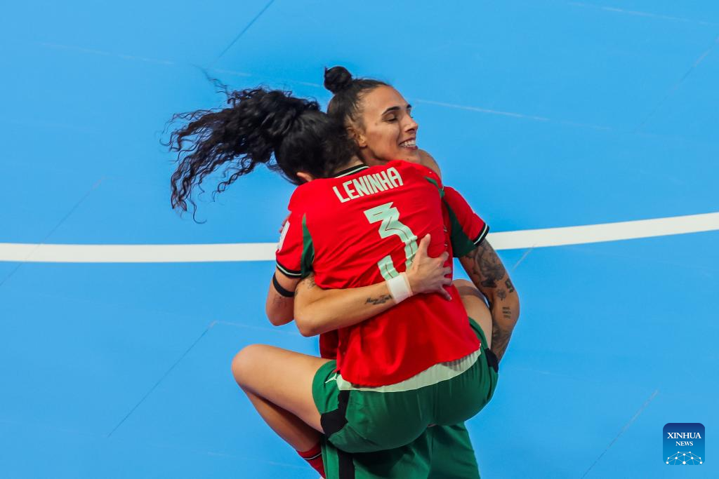Players of Portugal celebrate after scoring a goal during the semifinal match between Portugal and Argentina at the FIFA Futsal Women's World Cup 2025 in Pasig City, the Philippines, Dec. 5, 2025. (Xinhua/Rouelle Umali)