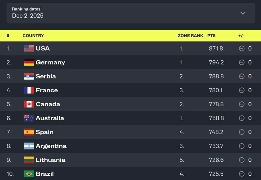 Outside the top ten, Turkiye overtook Latvia to take the No. 11 spot after two wins, while Rwanda was the biggest climber, rising nine spots to No. 81. ■