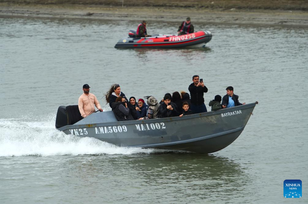 People enjoy boat tours during a fish fest in Neftchala, Azerbaijan, Dec. 4, 2025. Neftchala held its inaugural fish fest on Thursday to celebrate the city's 66th founding anniversary. Neftchala is located at the estuary of the Kura River, 180 kilometers away from the capital Baku. The area boasts vast waters and abundant fishery resources, serving as a habitat for numerous species of fish. (Xinhua/Chen Junfeng)