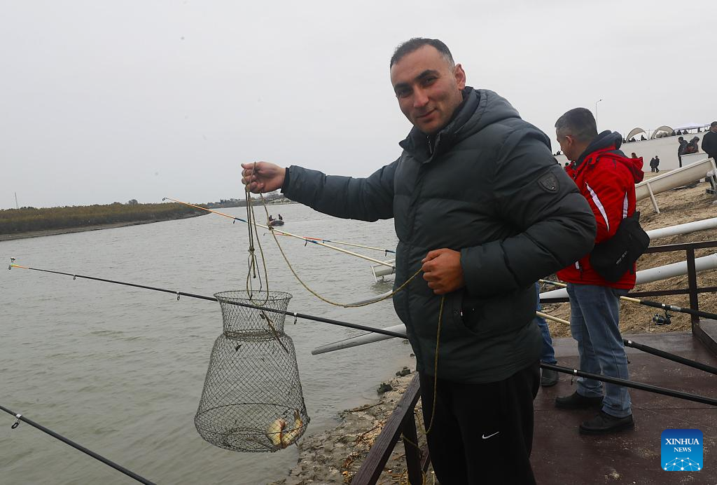 A man participates in a fishing competition during a fish fest in Neftchala, Azerbaijan, Dec. 4, 2025. Neftchala held its inaugural fish fest on Thursday to celebrate the city's 66th founding anniversary. Neftchala is located at the estuary of the Kura River, 180 kilometers away from the capital Baku. The area boasts vast waters and abundant fishery resources, serving as a habitat for numerous species of fish. (Xinhua/Chen Junfeng)