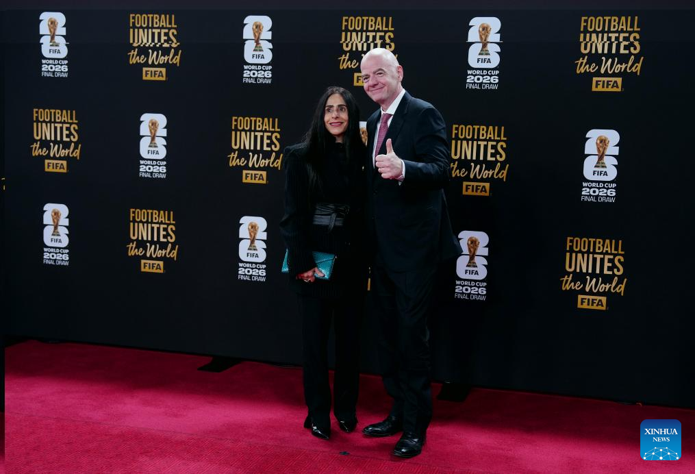 FIFA President Gianni Infantino (R) and his wife Leena Al Ashqar arrive for the welcome reception ahead of the final draw for the 2026 FIFA World Cup at John F. Kennedy Center for the Performing Arts in Washington, D.C., the United States, on Dec. 4, 2025. (Xinhua/Jia Haocheng)