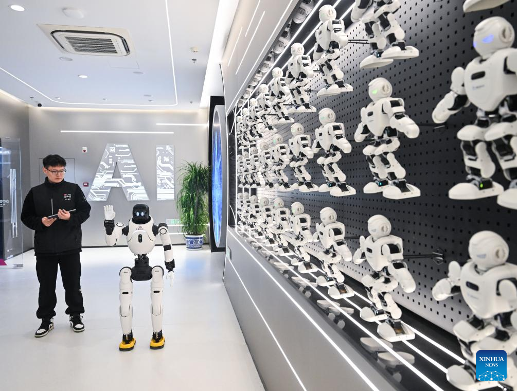 A humanoid robot greets people at an AI industry center in Nanjing, east China's Jiangsu Province, Dec. 4, 2025. (Xinhua/Ji Chunpeng)