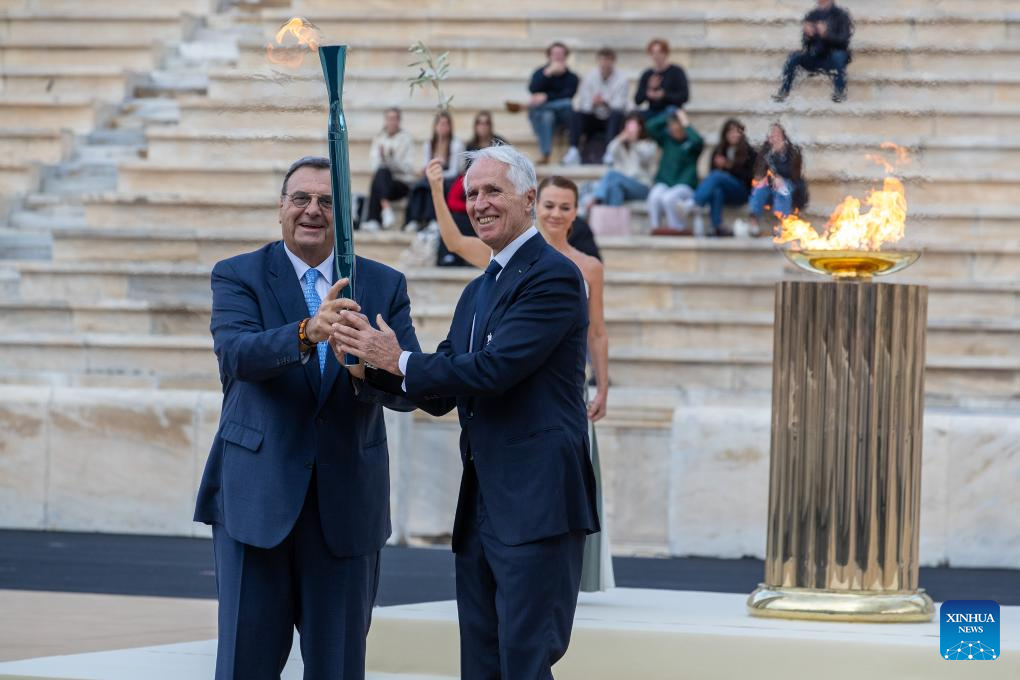 President of the organizing committee for the 2026 Winter Olympics Giovanni Malago (R) and president of the Hellenic Olympic Committee Isidoros Kouvelos are seen during the Olympic flame handover ceremony for the Milan-Cortina 2026 Winter Olympic Games at Panathenaic stadium in Athens, Greece, Dec. 4, 2025. (Photo by Marios Lolos/Xinhua)