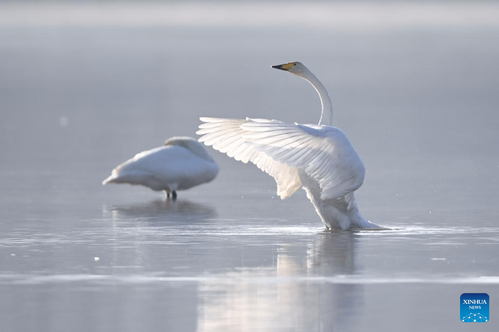 Swans are seen at the bank of the Yellow River in Hualong Hui Autonomous County of Haidong City, northwest China's Qinghai Province, Dec. 3, 2025. (Xinhua/Qi Zhiyue)