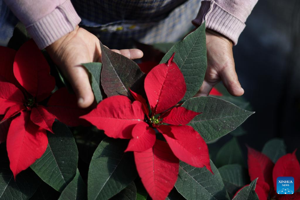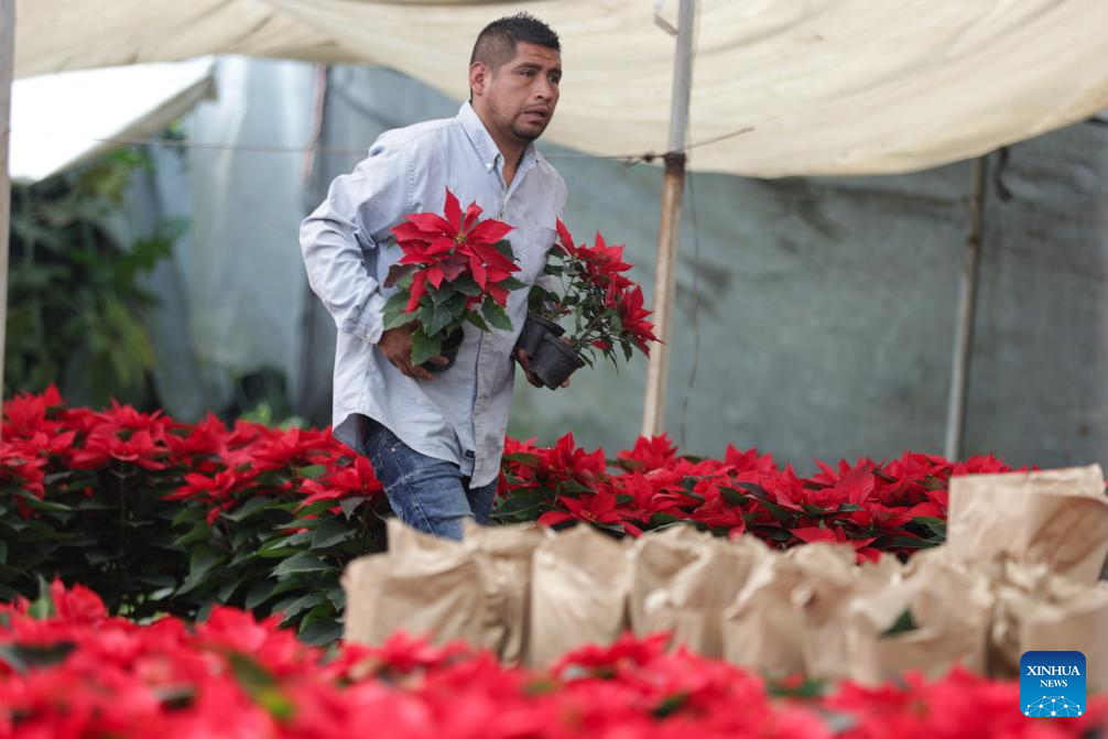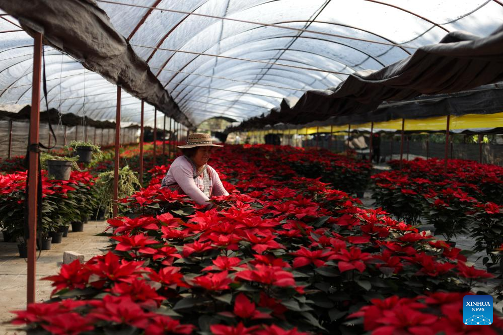 A farmer harvests poinsettia plants in Mexico City, the capital of Mexico, Dec. 5, 2025. (Photo by Francisco Canedo/Xinhua)