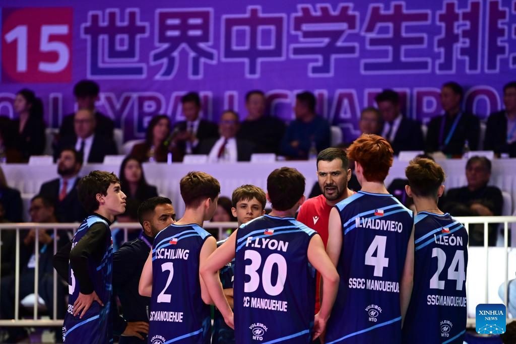 Players of Chile are instructed by their coach during the match against China's men's team 1 at the ISF U15 World School Volleyball Championship 2025 in Shangluo, northwest China's Shaanxi Province, Dec. 5, 2025. (Xinhua/Zou Jingyi)