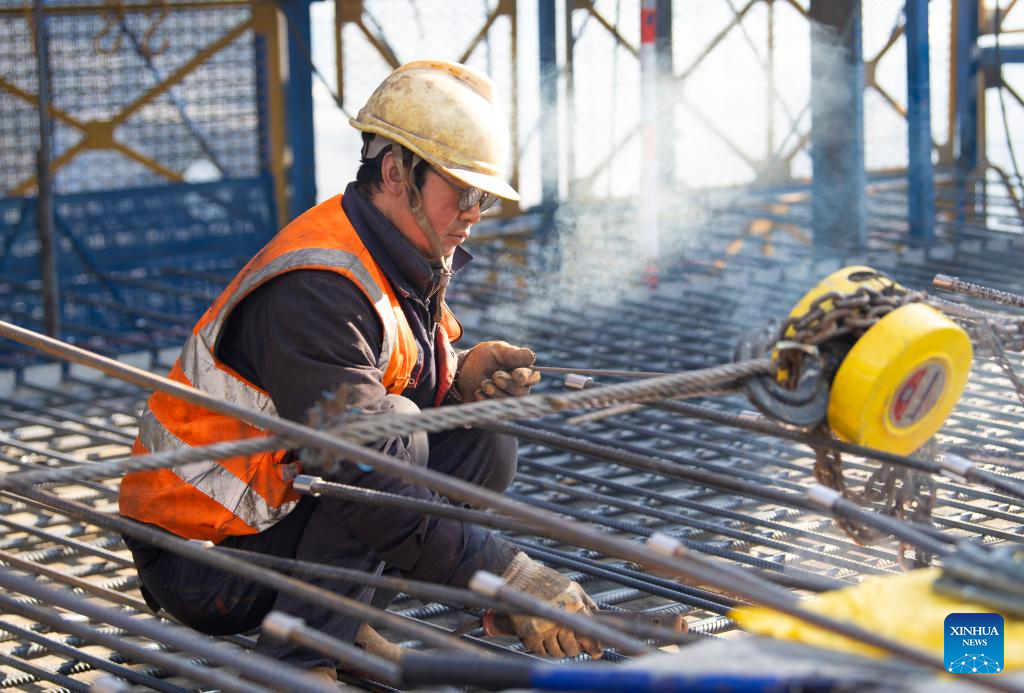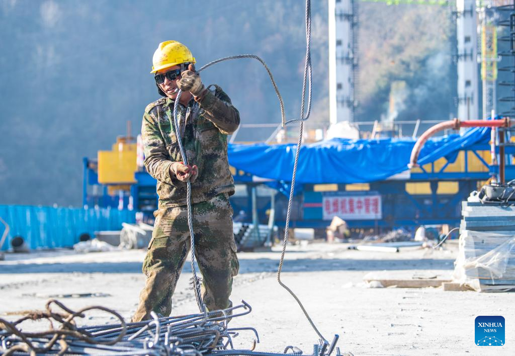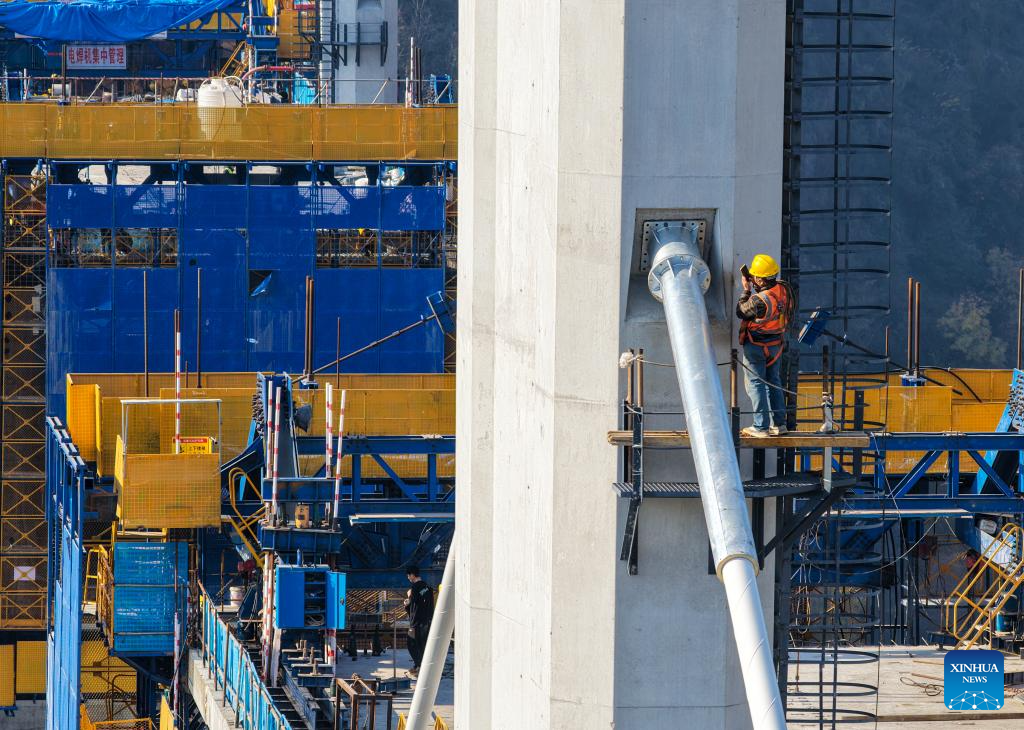 This photo taken on Dec. 7, 2025 shows a worker at the construction site of the Renhe grand bridge along the Xi'an-Chongqing high-speed railway in Chongqing, southwest China. Construction of tower columns of the Renhe grand bridge was fully completed on Sunday, while construction of the entire bridge is nearly 70 percent complete.