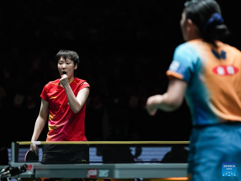 Wang Manyu (L) of China reacts in the women's singles match against Harimoto Miwa of Japan during the final match between China and Japan at the ITTF Mixed Team World Cup 2025 in Chengdu, southwest China's Sichuan Province, Dec. 7, 2025. (Xinhua/Wang Xi)