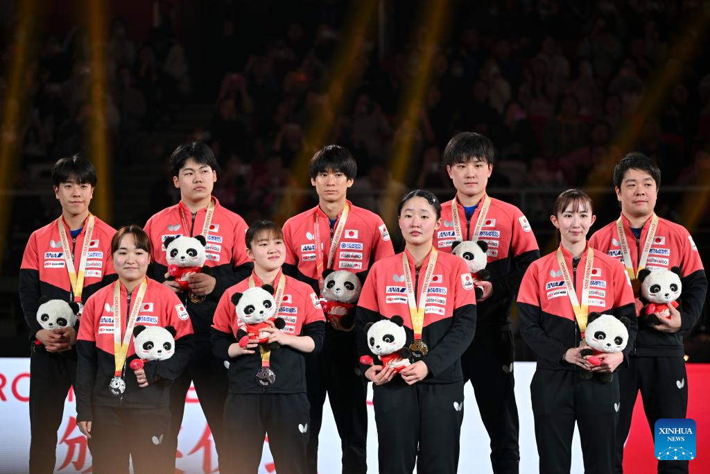 Gold medalists team China (C), silver medalists team Japan (L) and bronze medalists team Germany are seen during the awarding ceremony at the ITTF Mixed Team World Cup 2025 in Chengdu, southwest China's Sichuan Province, Dec. 7, 2025. (Xinhua/Wang Ying)
