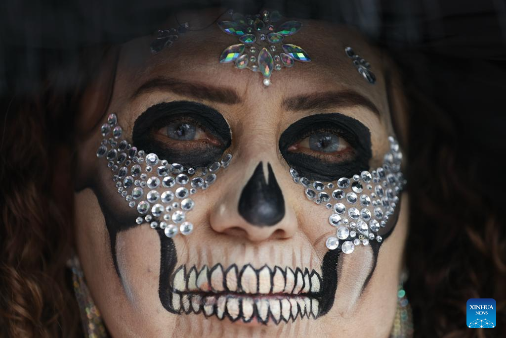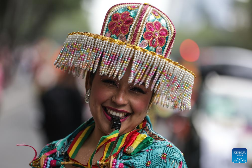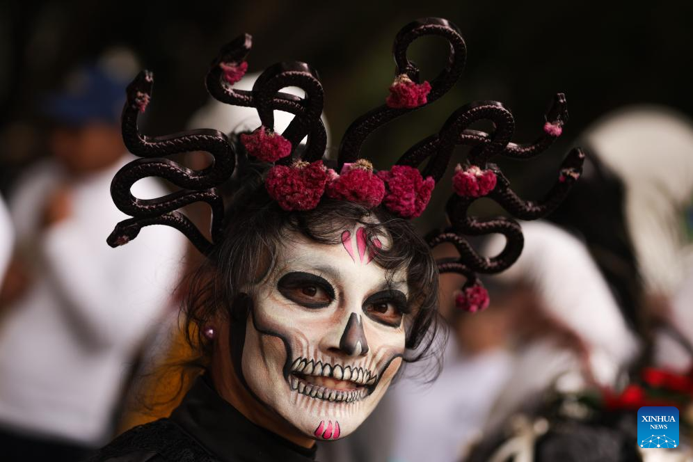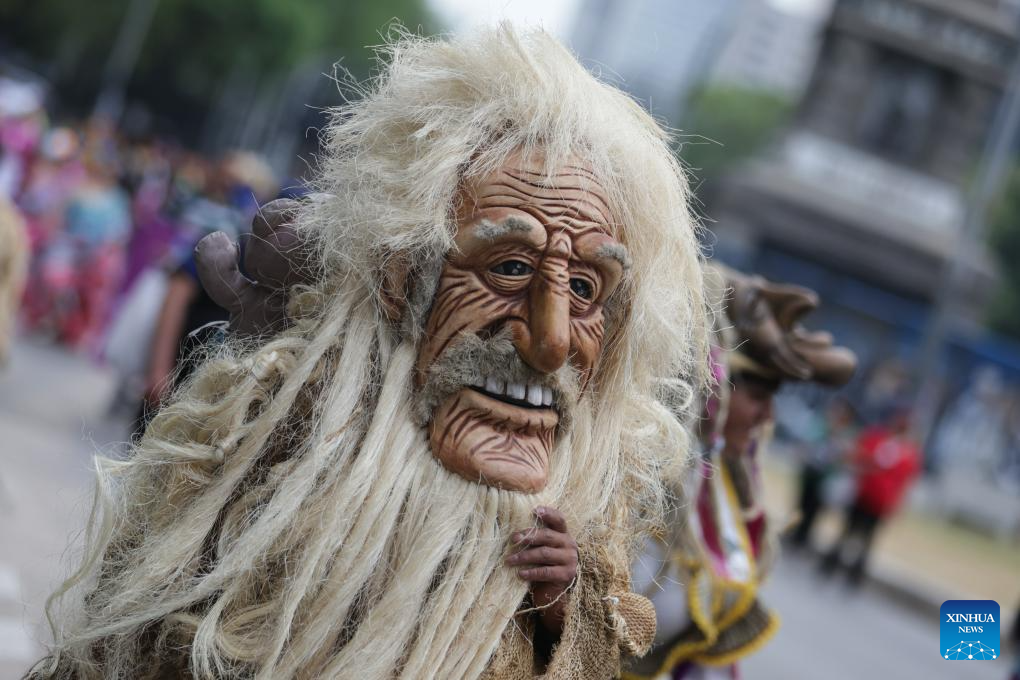 A costumed performer is pictured during the Villa-Zapata carnival in Mexico City, Mexico, on Dec. 6, 2025. The 11th Villa-Zapata carnival was hosted in Mexico City on Saturday. Folkloric dances, traditional music, and street processions were seen along the Paseo de la Reforma avenue during the event, promoting traditional Mexican culture while paying tribute to revolutionary leaders Emiliano Zapata and Francisco Villa in the Mexican Revolution of 1910-1920. (Xinhua/Li Mengxin)