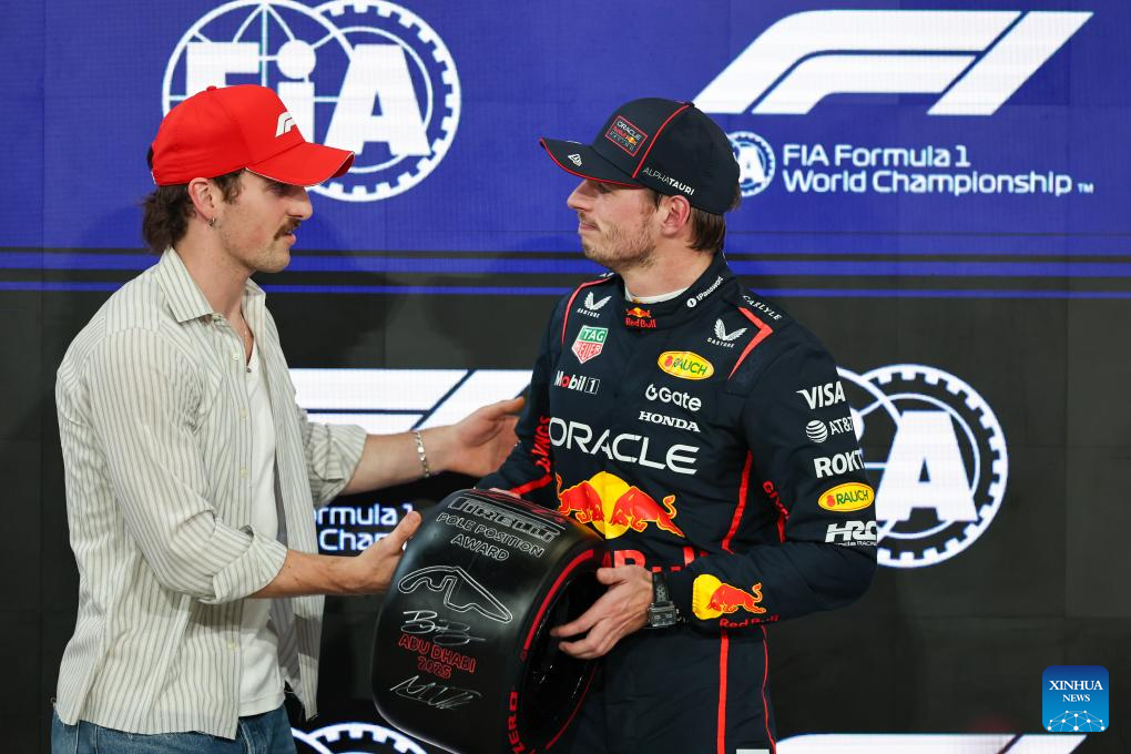 Red Bull's Dutch Driver Max Verstappen (R) receives the pole position award from American singer Benson Boone after the Qualifying of Formula One Abu Dhabi Grand Prix at the Yas Marina Circuit in Abu Dhabi, the United Arab Emirates, on Dec. 6, 2025. (Photo by Qian Jun/Xinhua)