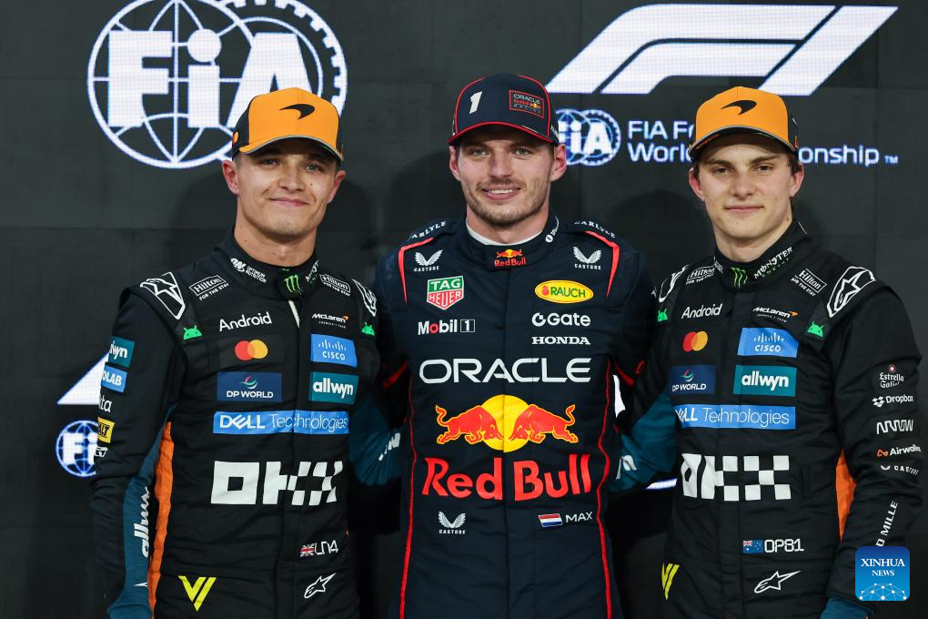 Red Bull's Dutch driver Max Verstappen (C), McLaren's British Driver Lando Norris (L) and Australian Driver Oscar Piastri pose after the Qualifying of Formula One Abu Dhabi Grand Prix at the Yas Marina Circuit in Abu Dhabi, the United Arab Emirates, on Dec. 6, 2025. (Photo by Qian Jun/Xinhua)