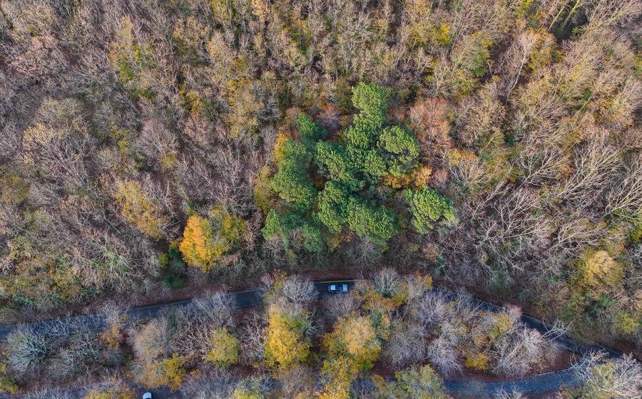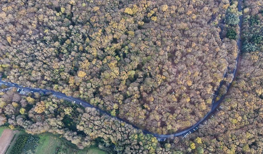 An aerial drone photo taken on Dec. 6, 2025, shows a road running through the Belgrad Forest in Istanbul, Türkiye. Belgrad Forest, located on the European side of Istanbul, is the largest woodland area on the outskirts of the city. (Xinhua/Liu Lei)
