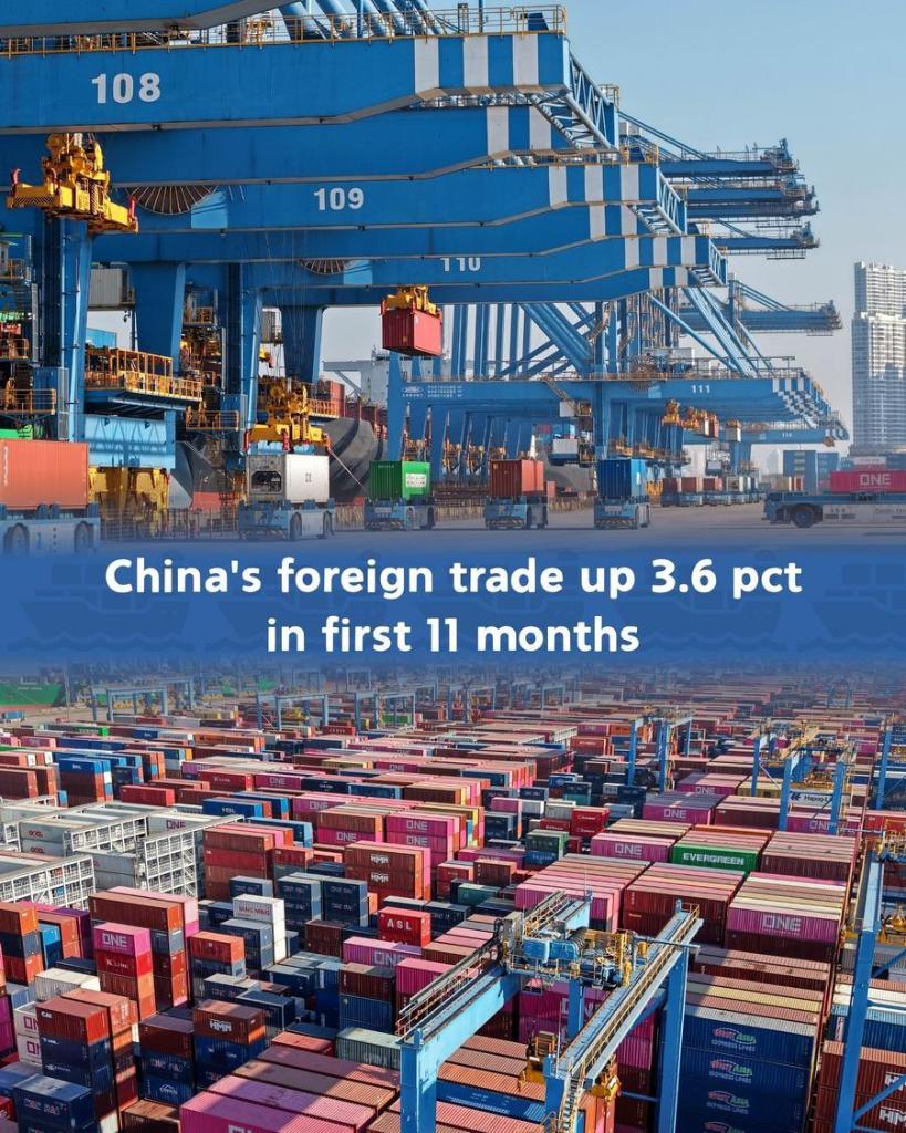 BEIJING, Dec. 8 (Xinhua) -- China's total goods imports and exports in yuan-denominated terms rose to 41.21 trillion yuan (about 5.82 trillion U.S. dollars) in the first 11 months of 2025, up 3.6 percent year on year, official data showed Monday.