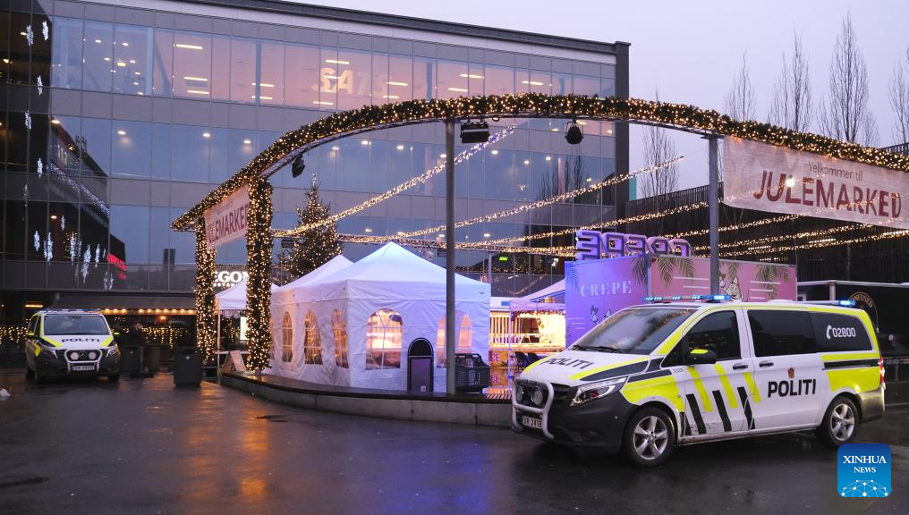 Two police vehicles are seen outside Storo Storsenter in Oslo, Norway, on Dec. 8, 2025. (Photo by Chen Yaqin/Xinhua)