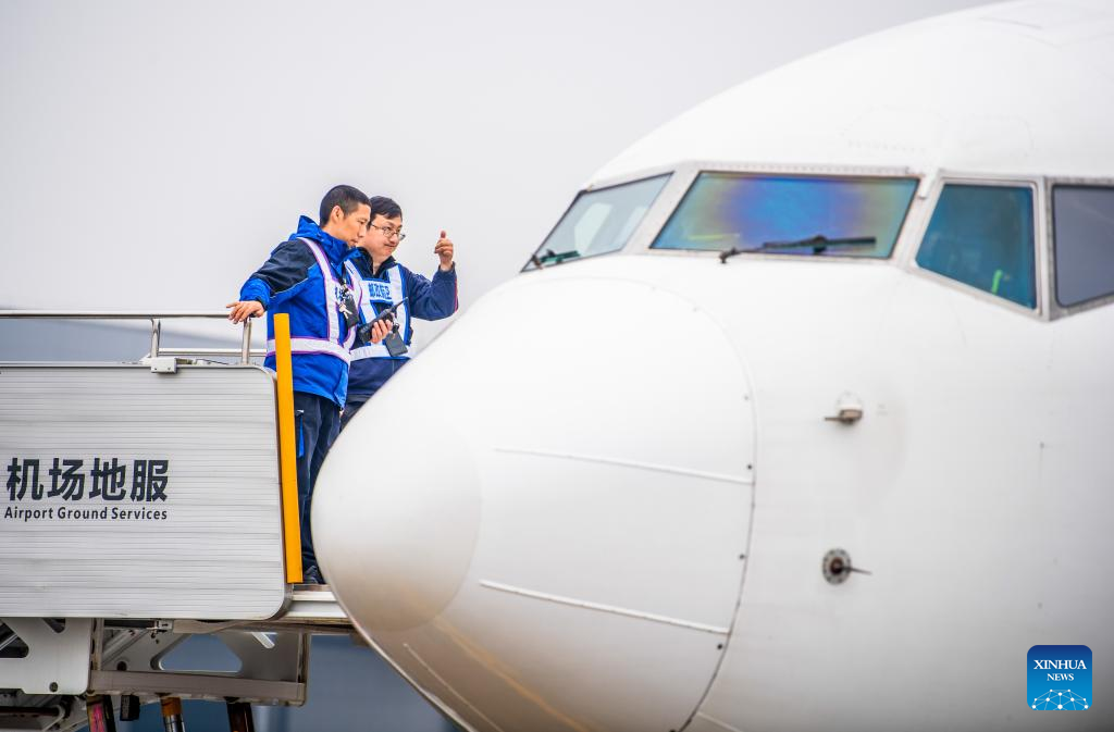 Staff members prepare for the inaugural flight of the Chongqing-Yangon cargo route at Chongqing Jiangbei International Airport in southwest China's Chongqing Municipality, Dec. 9, 2025.